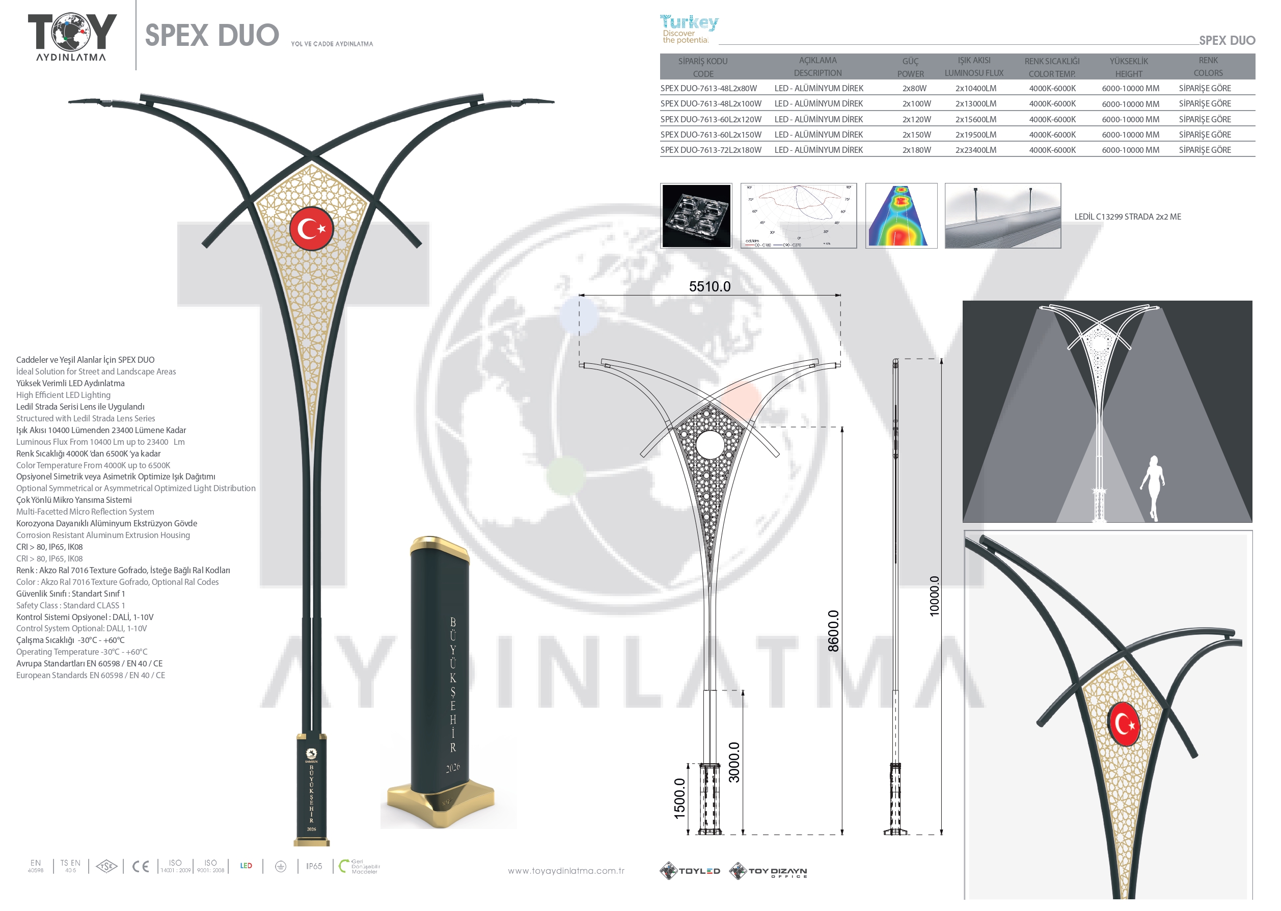 | SPEX DUO-7613-48L2X150W | LED - ALÜMİNYUM DİREK | 2X150 W | 2X19500LM | 4000-6000 K | 6000-10000 MM | Siparişe Göre |