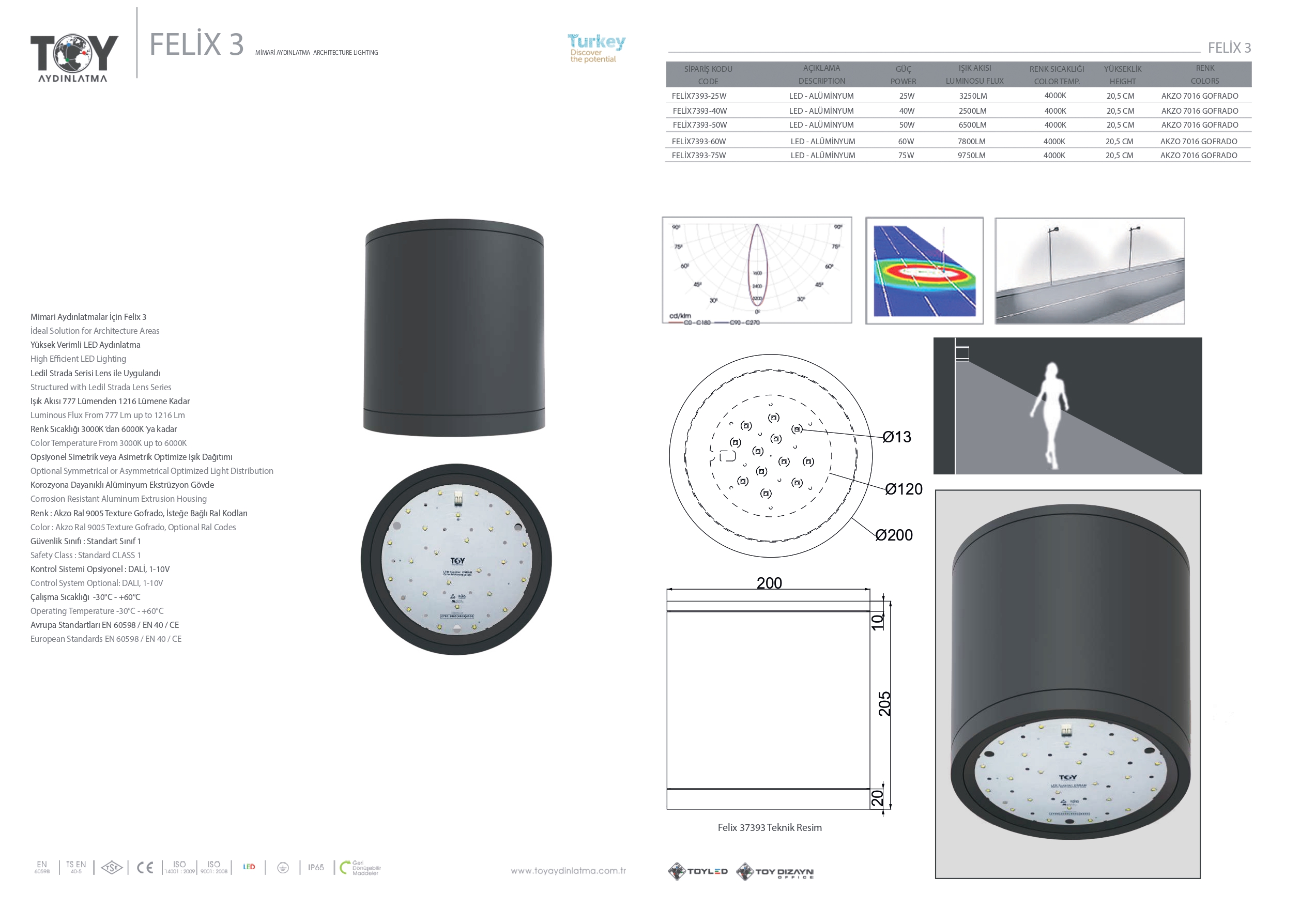 | FELİX37393-75W | LED - ALÜMİNYUM | 75W | 9750 LM | 4000K | 20.5CM | AKZO 7016 GOFRADO |