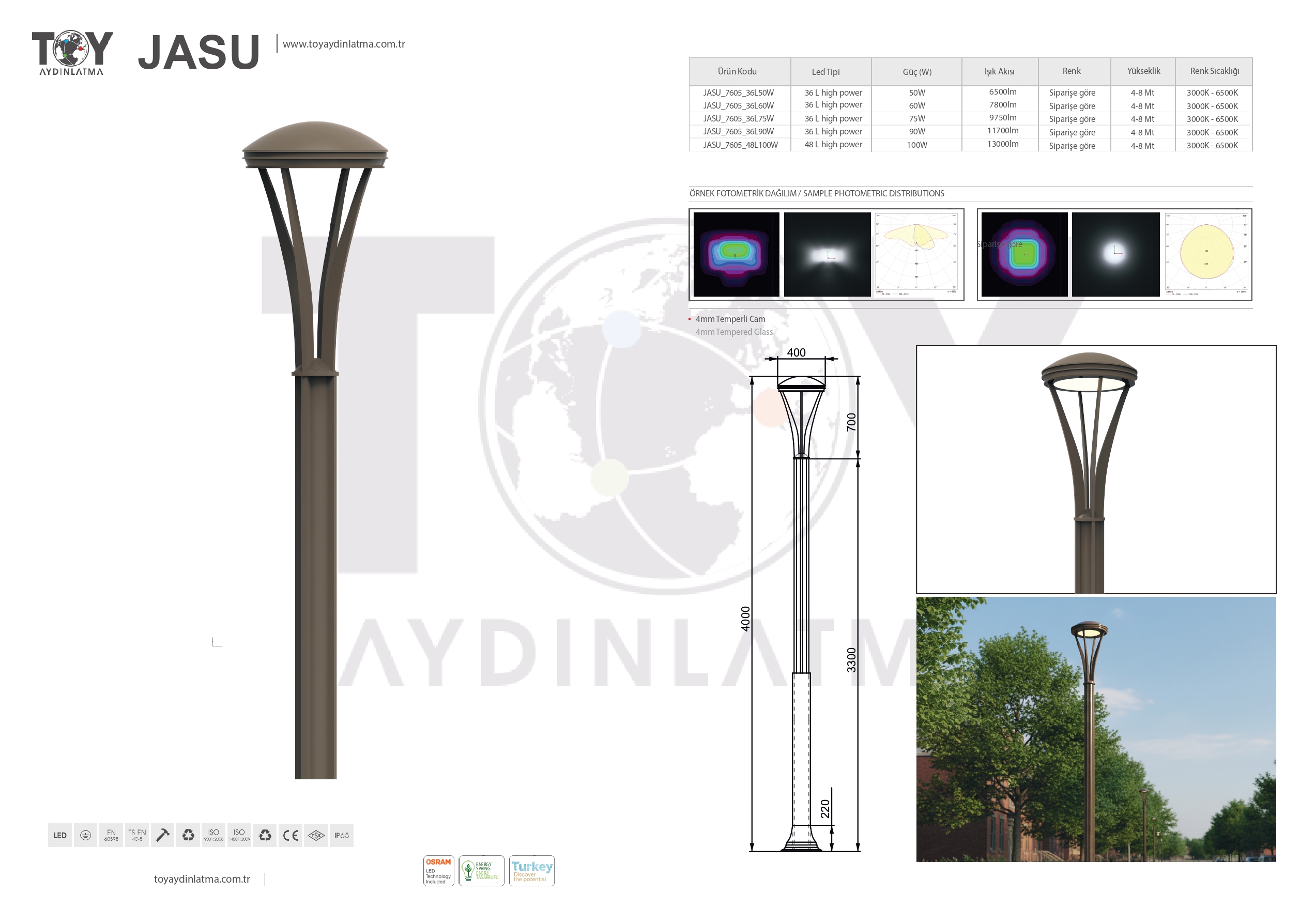 | JASU_7605_36L75W | LED - ALÜMİNYUM DİREK | 75 W | 9750 LM | 4000-6000 K | 4000-8000 MM | Siparişe Göre |