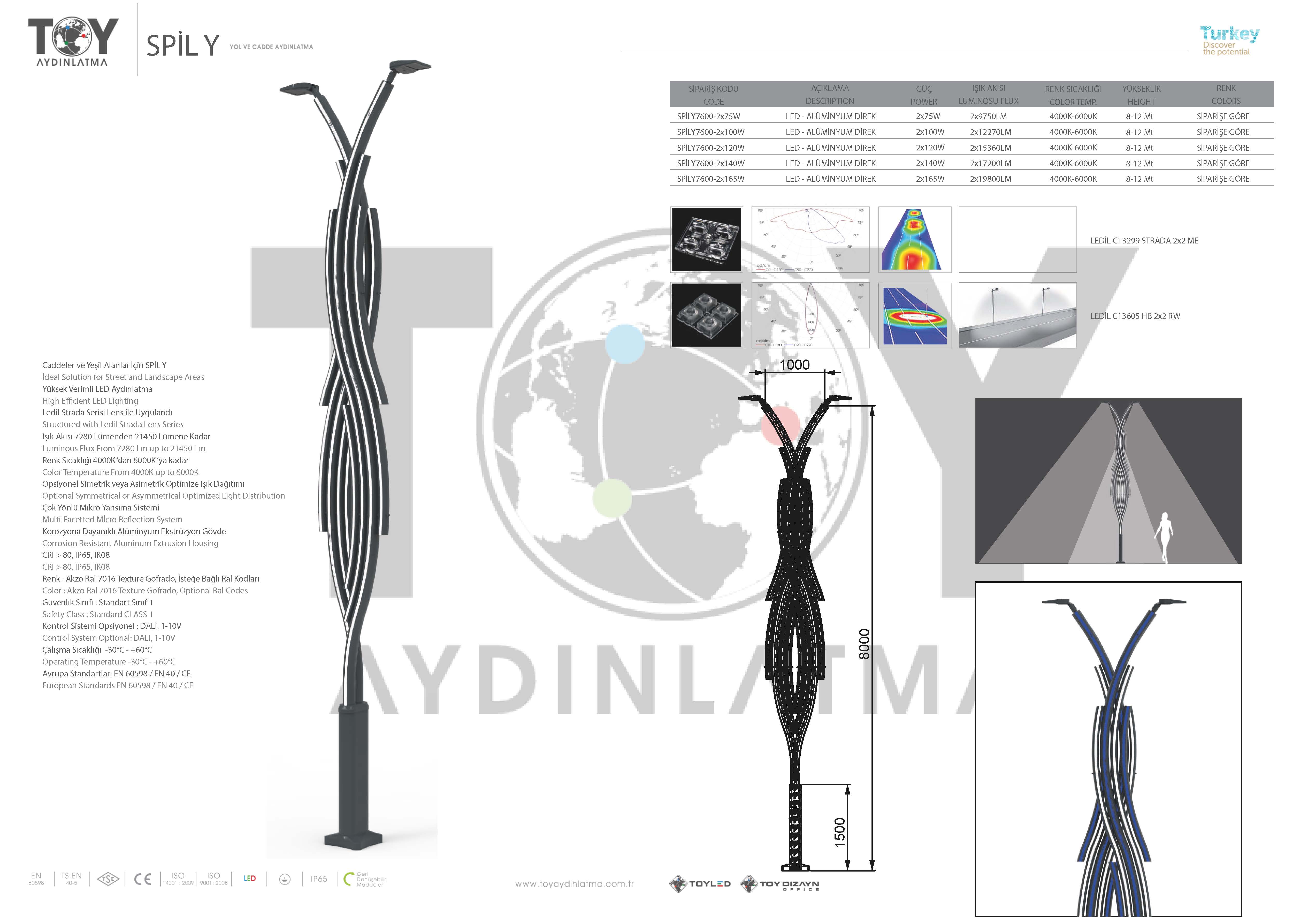 | SPİLY7600-2X75W | LED - ALÜMİNYUM DİREK | 2X75 W | 2X9750 LM | 4000K-6000K | 8 - 12 Mt | Siparişe Göre |