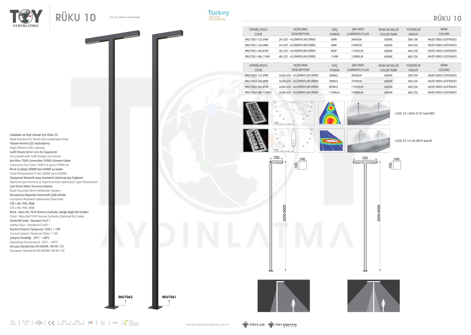 | RKU7062-12L39W | 2x12 LED - ALÜMİNYUM DİREK | 39 W x2 | 3640 LM x2 | 6000 K | 300 CM | AKZO 9005 GOFRADO |