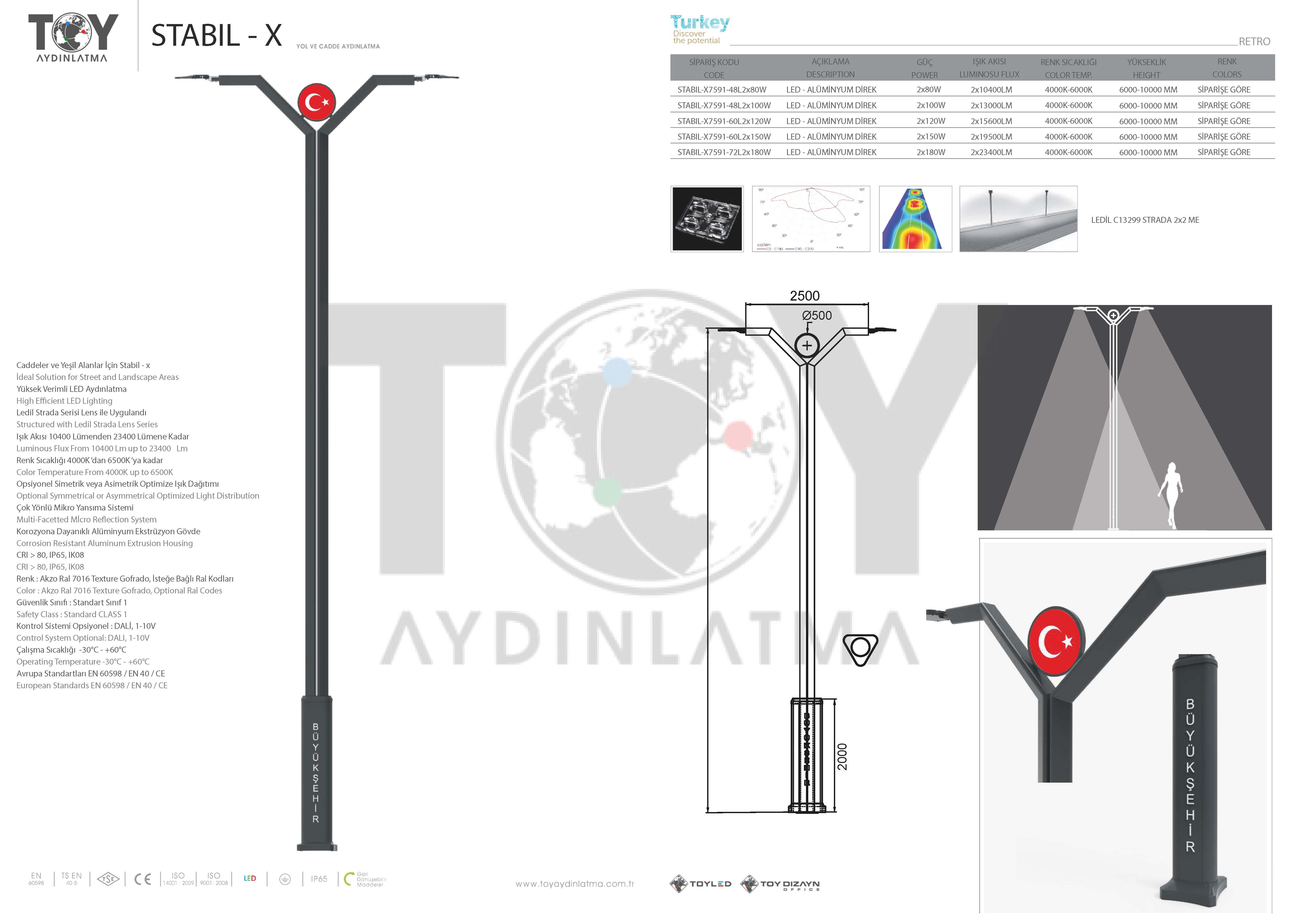 | STABIL-X7591-48L2X150W | LED - ALÜMİNYUM DİREK | 150 W | 2X19500LM | 4000-6000 K | 6000-10000 MM | Siparişe Göre |